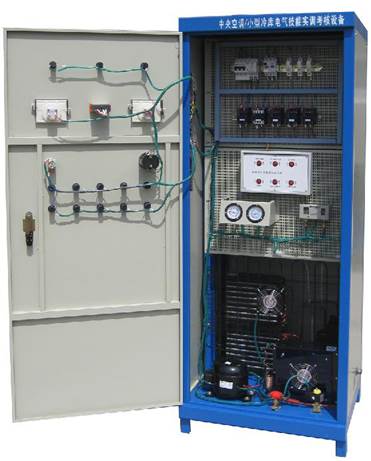 實訓設備采用雙面柜設計,一面為中央空調電氣控制系統,一面為小型冷庫電氣控制系統,根據中央空調及小型冷庫電氣控制線路的要求裝置了漏電開關、熔斷器、交流接觸器、壓力控制器、電磁閥、按鈕及指示儀表等控制器件,并設置了十幾項小型冷庫系統的常見故障。適應于職業(yè)院校、技工學校等用于制冷專業(yè)進行中央空調及小型冷庫系統控制線路的操作、故障演示及排除等教學實訓。